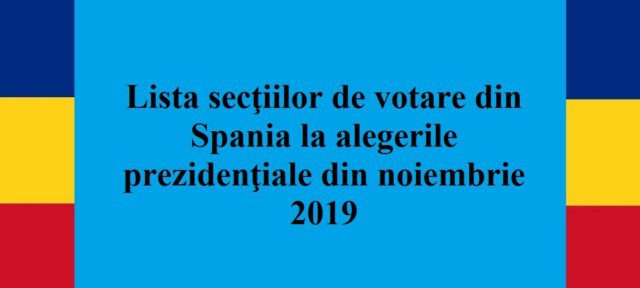 Pe teritoriul Spaniei vor fi organizate 143 de secţii de votare la alegerile prezidenţiale din noiembrie 2019, dintr-un total de 835 de secţii de votare în străinătate, conform listei aprobate de Autoritatea Electorală Permanentă din România (anexă).