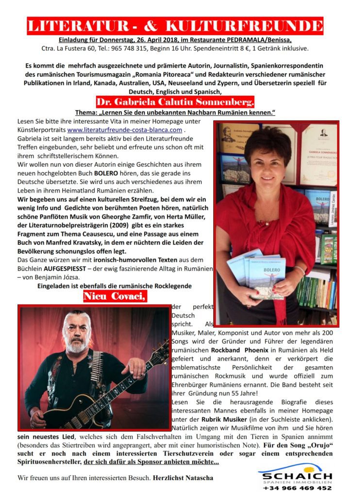 Cenaclul literar din comunitatea germană Benissa (zona Calpe, Teulada, Moraira, Benissa, provincia Alicante) va dedica României activitatea culturală a cenaclului din data de 26 aprilie, a.c., care se va desfășura în Calpe.