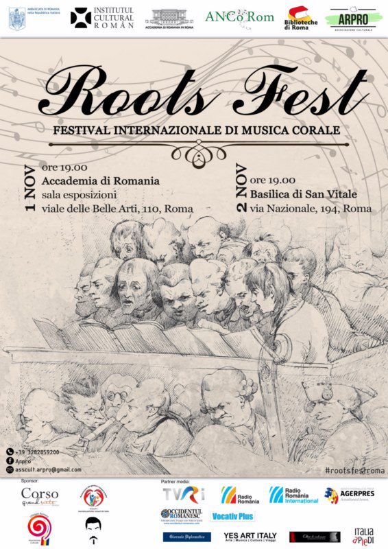 Festivalul internațional de muzică corală ”Roots Fest” a ajuns la cea de-a treia ediție, și se va desfășura la Roma în zilele de 1 și 2 noiembrie 2019. Festivalul este organizat de asociația culturală ARPRO în colaborare cu Accademia di Romania in Roma și Institutul Cultural Român. Evenimentul se desfășoară sub patronajul Ambasadei României în Italia, al Asociației Naționale Corale din România și al Biblioteche di Roma.