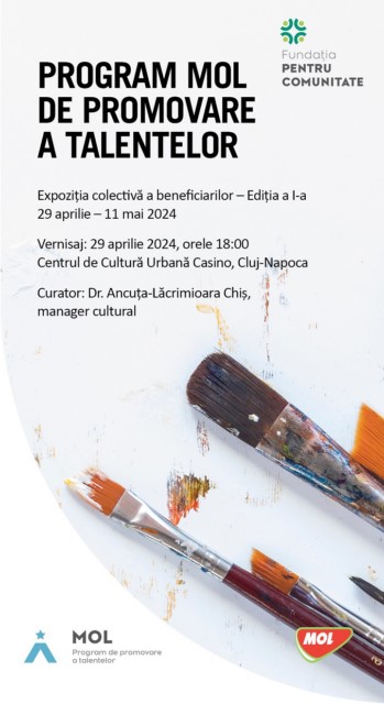 MOL România și Fundația Pentru Comunitate au deschis la Centrul de Cultură Urbană Casino din Cluj prima expoziție colectivă de arte plastice dedicată expunerii lucrărilor realizate de tinerii susținuți prin Programul MOL de promovare a talentelor. Prima ediție a acestui eveniment se derulează în perioada 29 aprilie – 11 mai 2024 și cuprinde lucrări din portofoliul a 22 de tineri artiști plastici din toată țara. MOL România și Fundația pentru Comunitate și-au propus să o transforme într-un eveniment de tradiție.