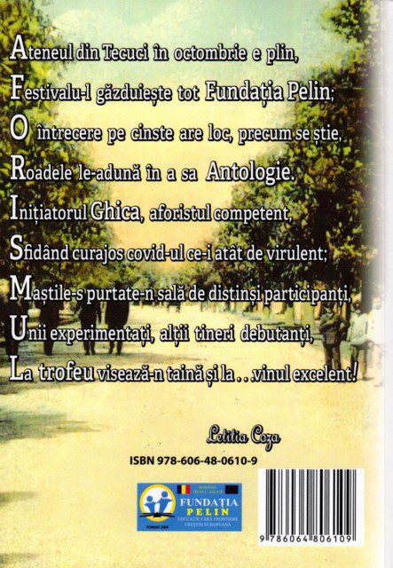 Ultimele pagini ale antologiei festivalului cuprind fotografii ce surprind  aspecte de la precedentele ediții, cele desfășurate în condiții de „normalitate”, cu prezența fizică a participanților și evenimente off-line. Coperțile I și IV sunt realizate de Doru Eugen Pelin, președintele Fundației Pelin, iar acrostihul de pe coperta IV este creat de Letiția Coza. Sperăm ca la a V-a ediție a festivalului sala atât de primitoare a Ateneului din Tecuci să fie plină de aspiranții la trofeu!
