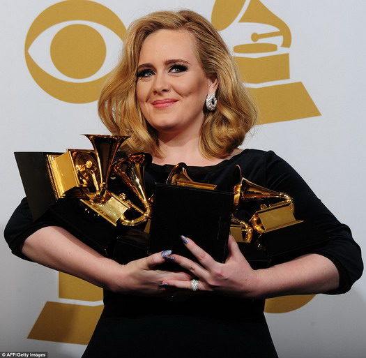 Adele – aflată la prima ei apariţie pe scenă după intervenţia suferită pe coardele vocale în toamna anului 2011 – a furat tot spectacolul, care a avut şi momente serioase, cu tributuri aduse regretatei cântăreţe Whitney Houston, ce a decedat sâmbătă. Cântăreaţa a fost descoperită moartă în cada de baie din camera sa de hotel, iar cauza decesului nu este deocamdată cunoscută.