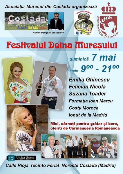Asociația „Mureșul” din Coslada organizează, cu sprijinul Primăriei, duminică, 7 mai, Festivalul „Doina Mureșului”.