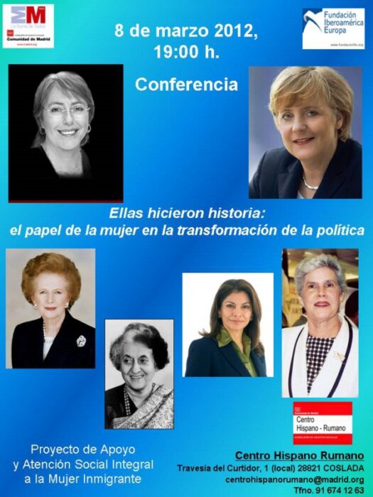 La Fundación Iberoamérica Europa, en el marco del Proyecto de Apoyo y Atención Social Integral a la Mujer Inmigrante, le invita a la conferencia “Ellas hicieron historia: el papel de la mujer en la transformación de la política”, que tendrá lugar el día 8 de marzo, a las 19:00 horas.