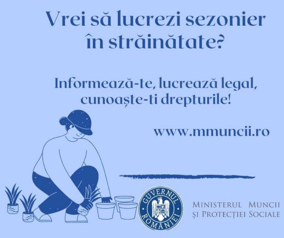 Ești lucrător sezonier în străinătate? Informează-te, lucrează legal și cunoaște-ți drepturile pentru a fi protejat!, este moto-ul campaniei de informare derulate de Ministerul Muncii și Protecției Sociale pentru informarea și protecția lucrătorilor sezonieri care au ales să desfășoare activități lucrative în străinătate.