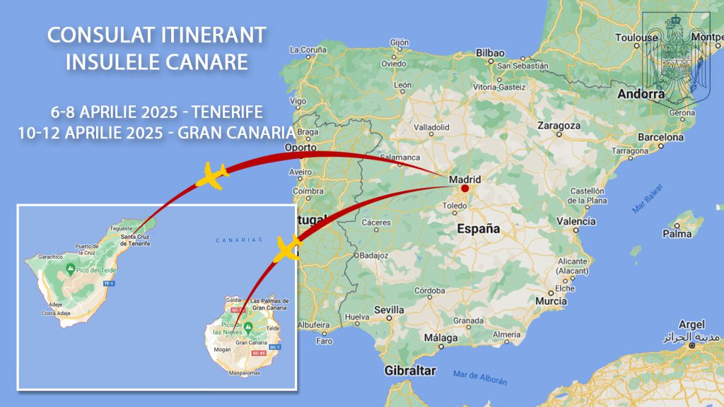 Consulatul General al României la Madrid anunță organizarea unui consulat itinerant în Insulele Canare, în perioada 6-12 aprilie 2025, pentru a oferi servicii și asistență consulară cetățenilor români din zonă. Această inițiativă are scopul de a facilita accesul comunității românești la servicii esențiale, fără a fi necesară deplasarea la Madrid.