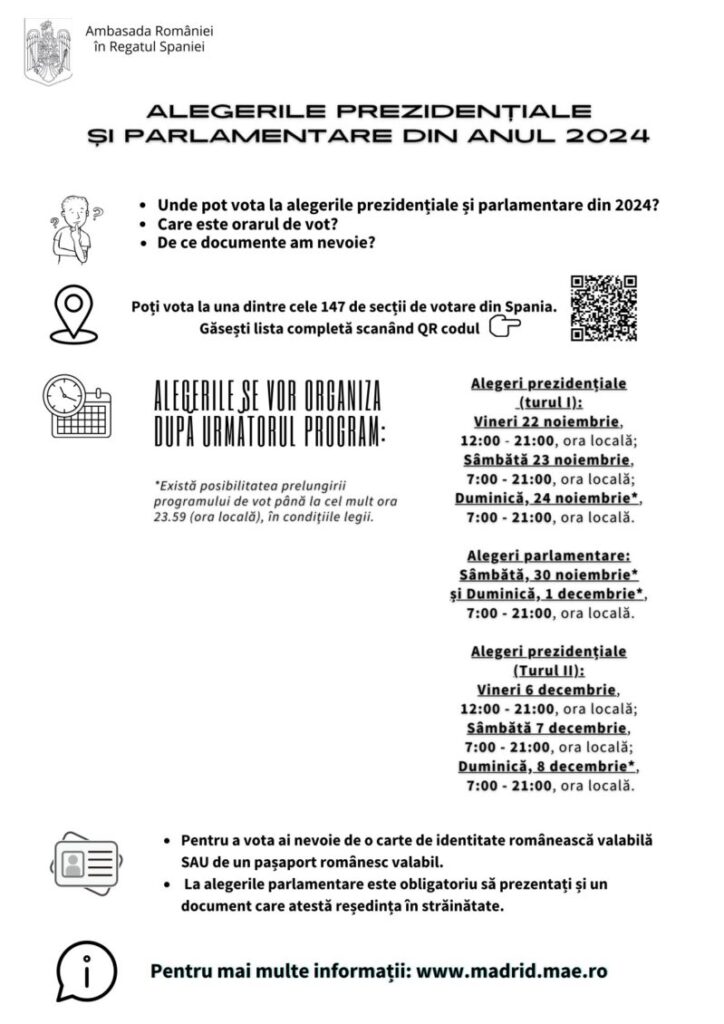 În perioada următoare vor avea loc alegerile prezidențiale și parlamentare. Cetățenii români din Spania vor avea posibilitatea să își exercite dreptul de vot în cele 147 de secții de votare organizate pe întreg teritoriul iberic de Ambasadă și oficiile consulare ale României din Spania. Vă prezentăm o serie de informații utile privind desfășurarea procesului electoral în cadrul secțiilor de votare din Spania.