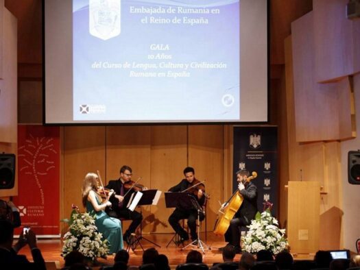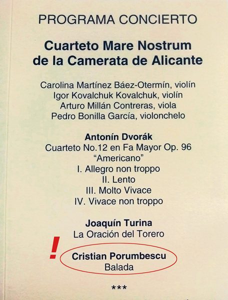 În partea a doua a programului a avut loc concertul susţinut de Cuarteto Mare Nostrum de la Camerata de Alicante. Toţi spanioli! Piesele alese pentru interpretare aparţin lui Antonin Dvorak – Cuarteto No 12 en Fa Mayor Op. 96, Joaquin Turina – La oracion del torero (Rugăciunea unui toreador) şi, în final, Cristian Porumbescu – Balada. Da, Cristian şi nu Ciprian Porumbescu! Era numele corect, Ciprian, prea greu de înţeles sau de pronunţat pentru invitaţii spanioli? Chiar şi aşa, schimbarea numelui unui cunoscut artist român nu are justificare. În timpul şi după terminarea evenimentului, s-au folosit cuvinte ca „emoţie şi dor românesc, tradiţie, trăire românească”, ceea ce e trist, având în vedere faptul că la Gala „10 Ani de Limbă, Cultură şi Civilizaţie românească”, limba şi cultura românească au fost aproape absente. Un singur discurs în limba natală şi o singură piesă muzicală românească, dar nu interpretată de un artist român.