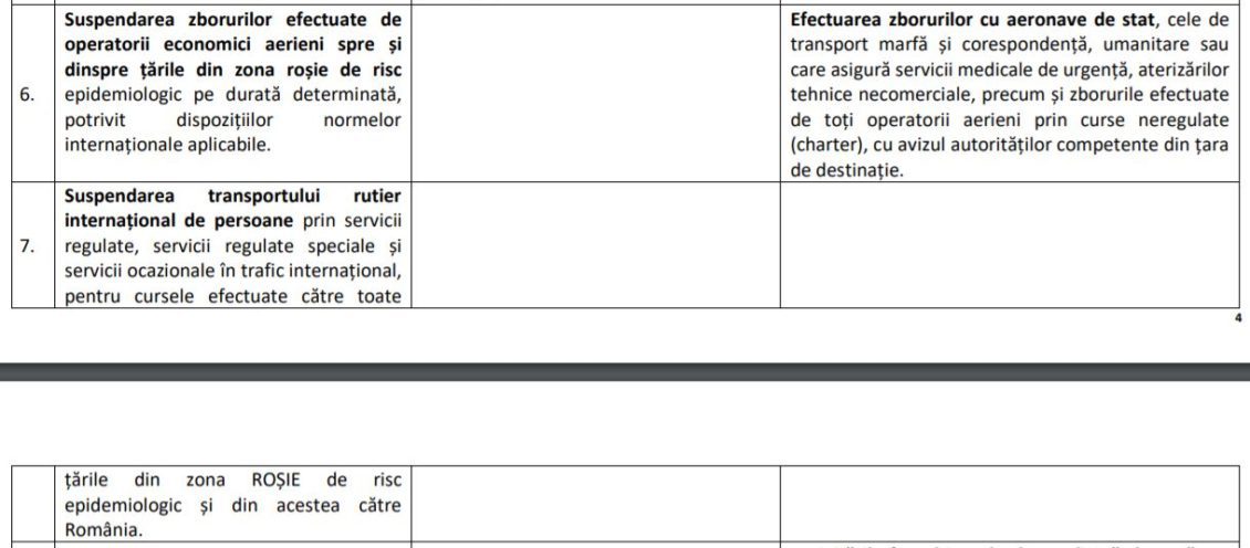 Potrivit documentului, se propune menținerea măsurii de „suspendare a zborurilor efectuate de operatorii economici aerieni spre și dinspre țările din zona roșie de risc epidemiologic pe durată determinată, potrivit dispozițiilor normelor internaționale aplicabile.