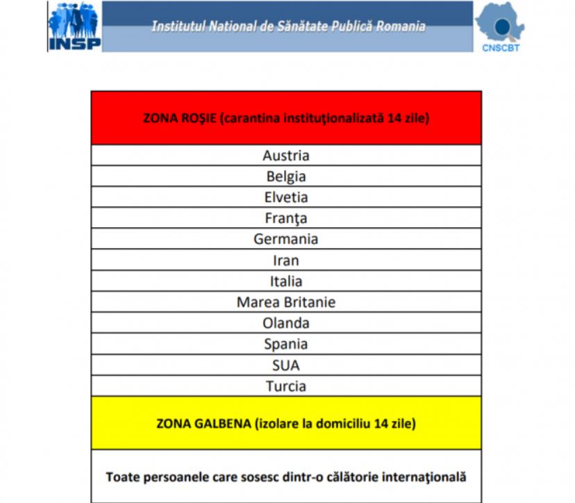 Institutul Național de Sănătate Publică (INSP) clasifică ca zone roșii următoarele țări: Italia, Spania, Franța, Elveția, Olanda, Marea Britanie, Belgia, Austria, Germania, Turcia, SUA și Iran.