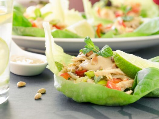 Preparare: amestecă puiul cu avocado și iaurt, condimentează, apoi umple frunzele de salată. Rulează ușor și servește rece.