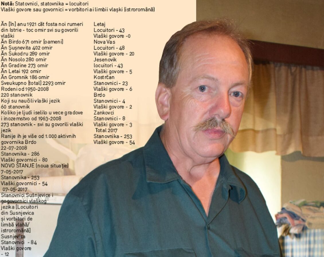 Școala este frumoasă, luminoasă, cu acoperiș nou, scări de faianță, băi care strălucesc, dar și o bucătărie modern dotată unde o femeie din sat le pregătește mâncarea. Copiii au vârste diferite s-au adunat de prin mai multe sate cu un singur scop: să învețe o limbă pe care doar bunicii o mai știu. Pepo Glavina ne invită acasă la el. Pepo are în jur de 60 de ani și este „trezorierul” acestei lumi. Intrăm în casa lui unde pereții sunt plini cu fotografii și articole din ziare despre istroromâni. Are un carnețel în care a scris fiecare nume de om care mai vorbește istroromâna în valea de lângă Marele Munte. Mai sunt doar 84. Restul au plecat în lume, în Australia, în America, luau vapoarele din Rjeka și dispăreau. Alții au murit. Doar ei au mai rămas. El, Guido și cei din carnețel.