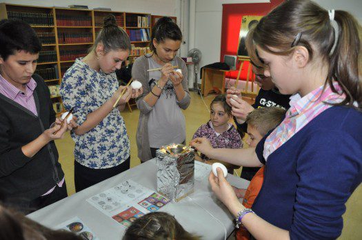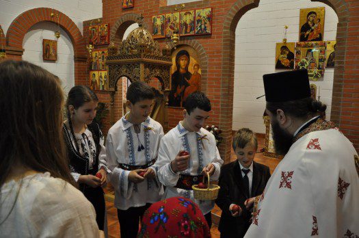 Seara, sub genericul: “Pe Cel ce S-a răstignit pentru noi, veniţi toţi să-L lăudăm!”, a avut loc în biserica parohială un concert de muzică religioasă şi poezie creştină dedicat sărbătorii Intrării Domnului în Ierusalim şi Săptămânii Patimilor. Concertul a fost pregătit şi susţinut de tineri credincioşi ai comunităţii noastre, sub îndrumarea domnului George Bucurică, protopsaltul parohiei. Cu o zi înainte, sâmbătă, 7 aprilie, în cadrul activităţilor şcolii parohiale, copiii, îndrumaţi de dra profesoară Florentina Craiu şi de dna preoteasă Gina Cimpoca, au desfăşurat de acum tradiţionala activitate de încondeiere a ouălor pentru sărbătoarea Învierii Domnului, copiii reuşind să treacă de la o simplă joacă la o activitate foarte serioasă, având ca scop deprinderea autenticului în acest frumos meşteşug. Ouăle se încondeiază folosind chişiţa, acesta fiind un instrument simplu, format dintr-o tijă metalică subţire care este fixată pe o coadă de lemn. Cu ajutorul acestei tije se ia ceara în stare topită şi se aplică pe coaja oului în diverse modele.
