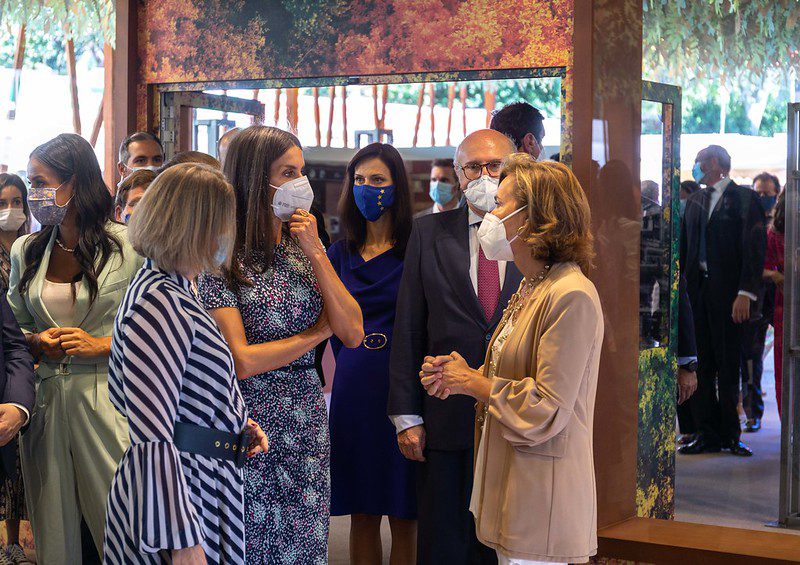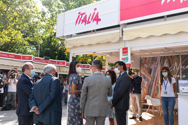 La siguiente parada fue en el Grupo Penguin Random House, donde le entregaron el libro de Pilar Quintana, premio Alfaguara 2021, Los Abismos. También recibió su visita el Pabellón Italia/Dante 700, con el que este año la Feria del Libro de Madrid conmemora el 700 aniversario fallecimiento de Dante Alighieri, donde se le entregó el libro Promover la belleza editado para conmemorar los 100 años del ENIT (Oficina de Turismo en Italia), y ella se mostró muy interesada en todas las actividades relacionadas con la efemérides del autor de la Divina Comedia.